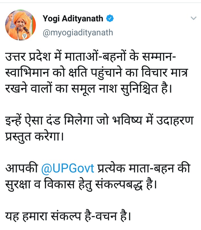 योगी आदित्यनाथ ने कहा, "उत्तर प्रदेश में माताओं-बहनों के सम्मान-स्वाभिमान को क्षति पहुंचाने का विचार मात्र रखने वालों का समूल नाश सुनिश्चित है। इन्हें ऐसा दंड मिलेगा जो भविष्य में उदाहरण प्रस्तुत करेगा। आपकी उत्तर प्रदेश सरकार प्रत्येक माता-बहन की सुरक्षा व विकास हेतु संकल्पबद्ध है।"