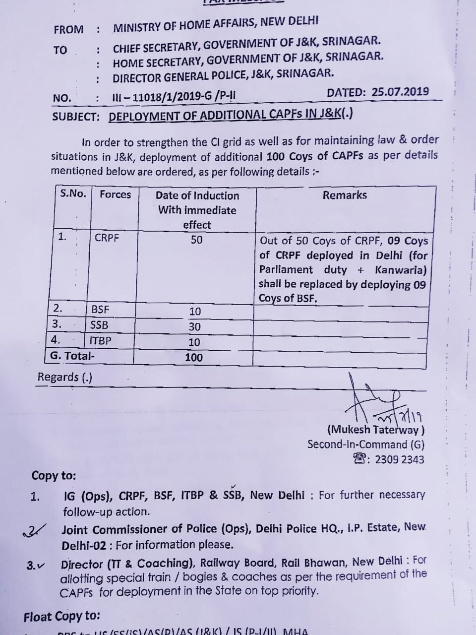 केंद्रीय गृह मंत्रालय ने जम्मू-कश्मीर में सुरक्षा बलों की 100 अतिरिक्त टुकड़ियों की तैनाती को मंजूरी दी है ताकि आतंकवाद विरोधी ग्रिड को मजबूत किया जा सके और राज्य में कानून और व्यवस्था की स्थिति को बनाए रखा जा सके।