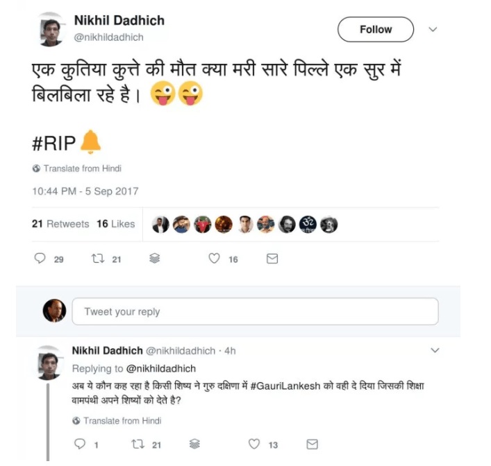 पिछले कुछ समय से सड़क से लेकर सोशल मीडिया तक ऐसे लोगों का उभार हुआ है जो हत्याओं को भी उचित ठहराते नजर आते हैं। मॉब लिंचिंग से लेकर हत्याओं को जायज ठहराने की प्रवृत्ति में भी बढ़ोतरी देखी जा सकती है। गौरी लंकेश की हत्या मामले में ऐसे कई उदाहरण सामने आए जो इस खतरनाक प्रवृत्ति के शिकार हैं। ट्विटर पर निखिल दधीच नाम के एक व्यक्ति लिखा है, “एक कुतिया कुत्ते की मौत क्या मरी सारे पिल्ले एक सुर में बिलबिला रहे है।”