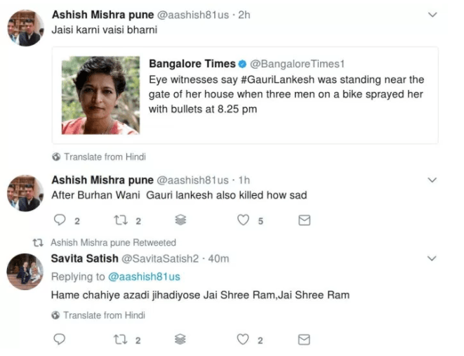 वहीं आशीष मिश्र (@aashish81us) नाम के ट्विटर अकाउंट को प्रधानमंत्री नरेंद्र मोदी, केंद्रीय मंत्री रविशंकर प्रसाद और विजय गोयल फॉलो करते हैं। आशीष मिश्र ने ट्वीट किया कि बुरहान वानी के बाद गौरी लंकेश को भी मार दिया गया। यह कितना दुखद है।