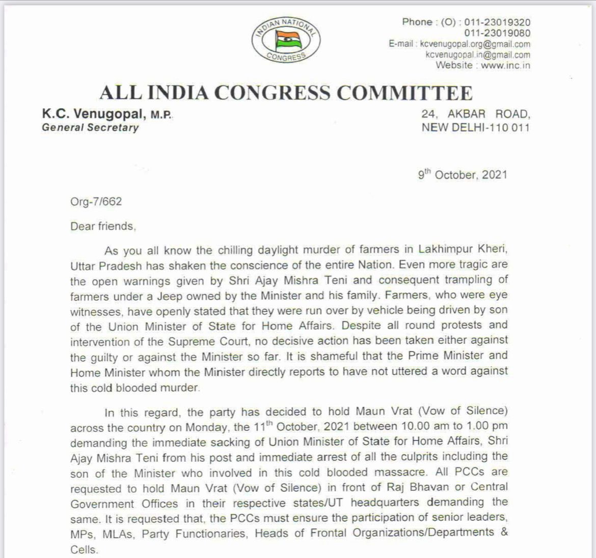 लखीमपुर खीरी हिंसा मामले में कांग्रेस लगातार केंद्र और राज्य सरकार पर हमलावर है। कांग्रेस पार्टी द्वारा आज देशभर में इस मामले में सभी आरोपियों की गिरफ्तारी और केंद्र गृह राज्यमंत्री अजय मिश्रा को पद से हटाने की मांग करते हुए 'मौन व्रत' कार्यक्रम का आयोजन किया गया है। सभी राज्यों में राजभवनों के बाहर सुबह 10 से दोपहर 1 बजे के बीच कांग्रेस नेता इकट्ठे होकर मौन रखेंगे।