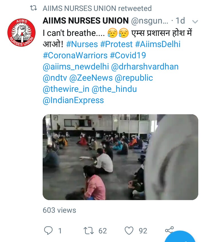 दिल्ली स्थित अखिल भारतीय आयुर्विज्ञान संस्थान (एम्स) में कामकाज की स्थिति को लेकर नर्स यूनियन का प्रदर्शन लगातार जारी है। एम्स में अब तक 47 नर्सों समेत 329 से ज्यादा कर्मचारी कोरोना वायरस से संक्रमित पाए जा चुके हैं। नर्स यूनियन के सदस्य पिछले एक जून से धरना दे रहे हैं। यूनियन की मांग है कि पीपीई किट के साथ काम के घंटों को चार घंटे तक सीमित किया जाए। लंबे समय तक पीपीई किट पहनकर रखने से उन्हें कई स्वास्थ्य समस्याएं हो रही हैं।