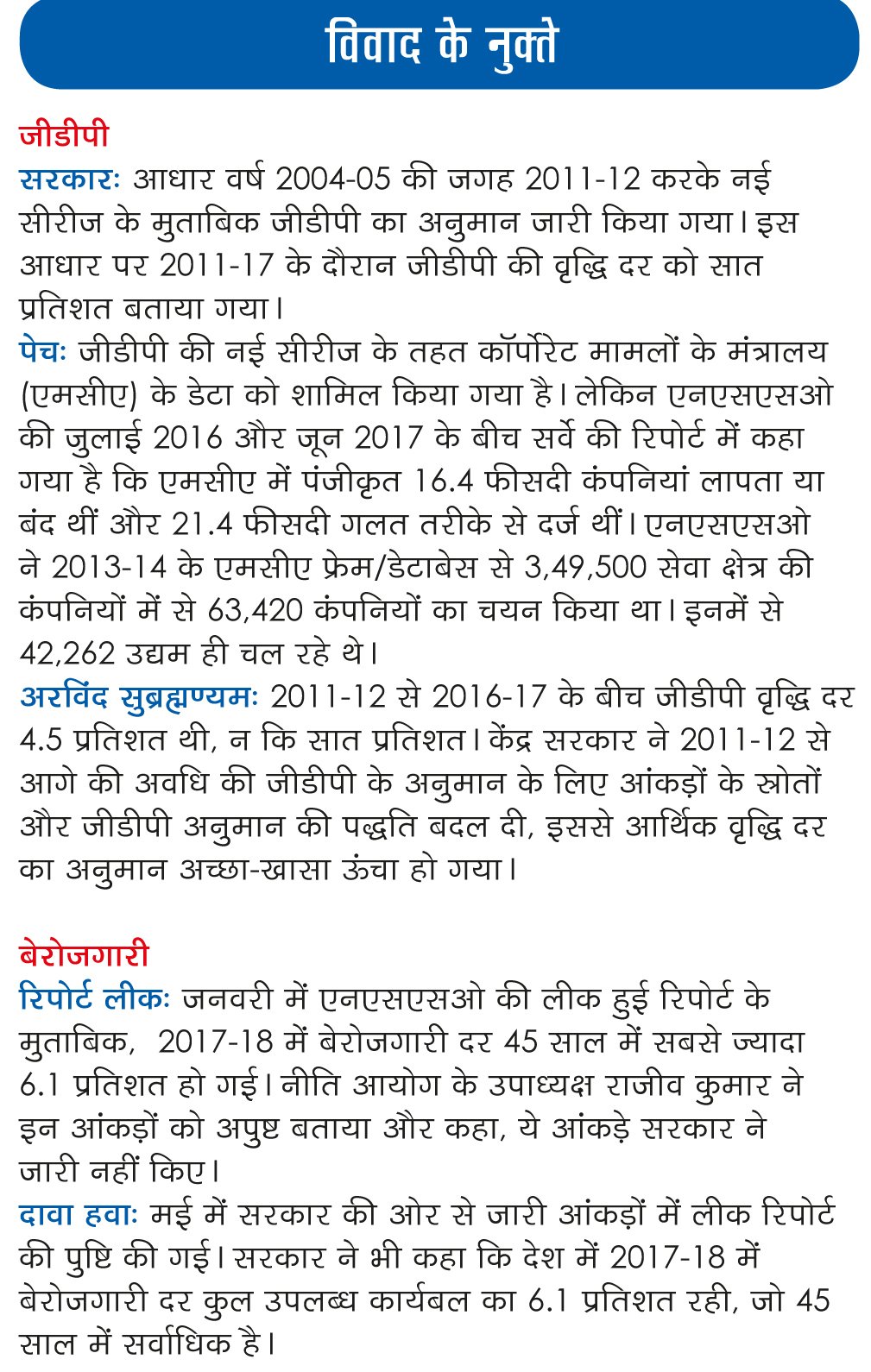 सरकार जीडीपी के अनुमानों पर उठाए गए सवालों के जवाब में स्पष्टीकरण जारी कर रही है, लेकिन हाल में पूर्व मुख्य आर्थिक सलाहकार (सीईए) अरविंद सुब्रह्मण्यम ने अपने एक अध्ययन में उसे खारिज कर दिया और कहा कि 2011-12 और 2016-17 के दौरान जीडीपी वृद्धि दर के आंकड़े को बढ़ा-चढ़ा कर पेश किया गया। सुब्रह्मण्यम के शोध से पता चला है कि जीडीपी की गणना के लिए पद्धतिगत बदलावों के परिणामस्वरूप इन वर्षों में हर साल लगभग 2.5 प्रतिशत तक वृद्धि अधिक दिखाई गई है। इस अवधि में यूपीए और एनडीए दोनों सरकारों के आंकड़ों को शामिल किया गया है। यह पहली बार नहीं है कि अरविंद सुब्रह्मण्यम ने सरकार से उलट तर्क पेश किए हैं। वे मुख्य आर्थिक सलाहकार रहने के दौरान भी ऐसा कर चुके हैं और यहां तक कि नोटबंदी पर भी सरकारी रुख का समर्थन नहीं कर रहे थे। उनकी देखरेख में तैयार किए गए 2016-17 के आर्थिक सर्वेक्षण में कहा गया था, “नोटबंदी अल्पकालिक संकट पैदा करेगी और दूरगामी लाभ के लिए आधार मुहैया कराएगी।” यह साफ-साफ कबूलनामा था कि “संकट वास्तविक और महत्वपूर्ण है” और उसकी कीमत गरीब लोगों को अधिक अदा करनी होगी, जो “अनौपचारिक और नकदी अर्थव्यवस्था” पर आश्रित हैं, क्योंकि इससे उनकी आमदनी और रोजगार घटेगा।