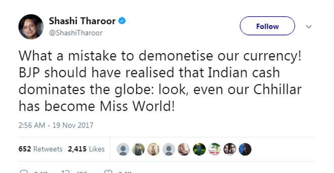 उन्होंने ट्वीट किया,"करेंसी का विमुद्रीकरण गलती थी। भाजपा को ये एहसास होना चाहिए कि भारतीय कैश दुनिया पर राज करता है, यहां तक कि हमारी छिल्लर भी मिस वर्ल्ड बन गईं।" थरूर ने मानुषी के सरनेम की ओर इशारा किया था। इस ट्वीट का मतलब शायद 'चिल्लर' से था। भाजपा प्रवक्ता संबित पात्रा ने इसे रीट्वीट करते हुए इस ट्वीट और थरूर की भाषा को गलत बताया। सफाई में थरूर ने फिर से एक ट्वीट किया और बताया कि वो ट्वीट उन्होंने बस हल्के-फुल्के अंदाज में किया है।