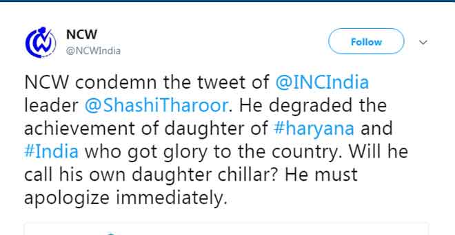 उन्होंने यह भी लिखा कि मानुषी की जीत पर बेशक वो बहुत खुश हैं खासकर उनके जवाब ने उन्हें बेहद प्रभावित किया है। उनके इस ट्वीट को राष्ट्रीय महिला आयोग ने गंभीरता से लिया है। आयोग ने थरूर को नोटिस जारी कर दिया है। इससे पहले फिल्म 'पद्मावती' पर विवाद में भारतीय राजाओं पर टिप्पणी करने को लेकर कांग्रेस नेता और मध्य प्रदेश के गुना से सांसद ज्योतिरादित्य सिंधिया और हिमाचल प्रदेश के मुख्यमंत्री वीरभद्र सिंह ने थरूर को इतिहास पढ़ने की नसीहत दे डाली थी।