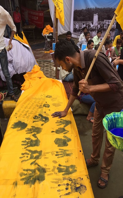 पार्टी के दिल्ली प्रदेश अध्यक्ष अनुपम ने बताया, 'उपवास कर रहे स्वराज इंडिया के साथियों ने समर्थन-स्वरूप बसंती रंग के एक कपड़े के थान पर नीले रंग से अपने हाथ का निशान लगाया है। ये नीला रंग नर्मदा का प्रतीक है और बसंती रंग स्वराज इंडिया की प्रतिबद्धता का प्रतीक। उपवास पर बैठे साथियों के समर्थन-प्रतीक इस बसंती थान को नर्मदा बचाओ आंदोलन के प्रतिनिधियों को भेंट किया गया जाएगा।'