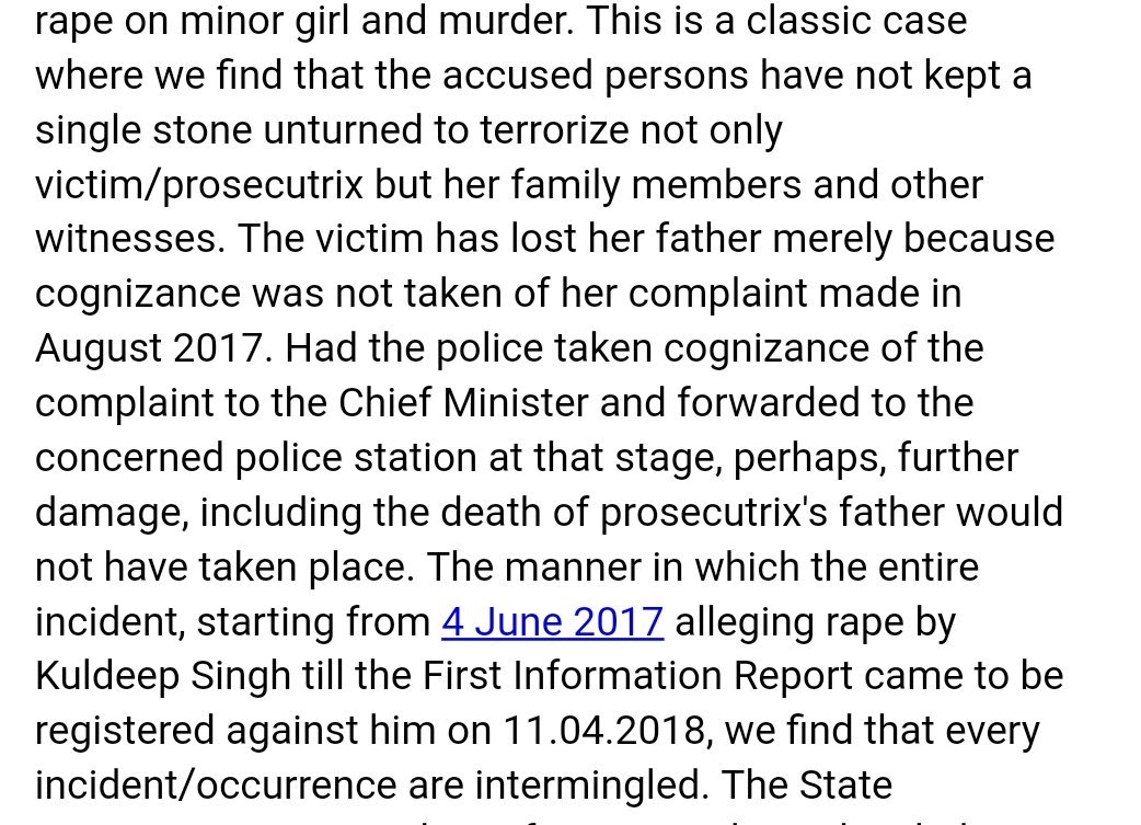 20 पन्नों के इस आदेश के मुताबिक, अगर यूपी पुलिस पीड़िता की मुख्यमंत्री से शिकायत पर समय रहते कार्रवाई करती तो शायद उसके पिता जिंदा होते। लेकिन जिले की पुलिस और प्रशासन पर आरोपी विधायक का इतना प्रभाव था कि मेडिकल ऑफिसर ने पीड़िता का मेडिकल करने से इंकार कर दिया। पीड़िता और उसके परिजन इंसाफ के लिए इधर-उधर भटकते रहे, लेकिन मुख्यमंत्री तक पहुंचने के बावजूद उनकी शिकायत दर्ज नहीं हुई। आरोपी के दबाव से तंग आकर पीड़िता ने आत्मदाह का प्रयास भी किया। इंसाफ मिलने की जगह उल्टे पीड़िता के पिता को ही गिरफ्तार कर लिया गया और हिरासत में बुरी तरह मारा-पीटा।