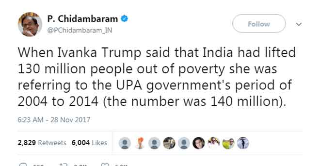 चिदंबरम ने एक ट्वीट में कहा है कि गरीबी हटाने की जिस उपलब्धि का इवांका ने जिक्र किया वह यूपीए सरकार के कार्यकाल में मिली। मनमोहन सिंह के नेतृत्व वाली सरकार ने 2004 से 2014 के दौरान यह काम किया था। असल में यह आंकड़ा 14 करोड़ लोगों का है। उन्होंने ट्वीट किया, जब इवांका ट्रंप ने कहा कि भारत ने 130 मिलियन लोगों को गरीबी से बाहर निकाला है, वह 2004 से 2014 तक की यूपीए सरकार के कार्यकाल के बारे में बात कर रही थीं।