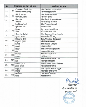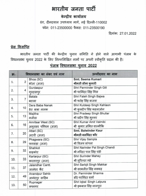 केंद्रीय मंत्री हरदीप सिंह पुरी और भाजपा महासचिव व पंजाब के प्रभारी दुष्यंत गौतम और महासचिव तरुण चुघ ने सभी प्रत्याशियों के नामों का ऐलान किया। जारी लिस्ट के अनुसार, फतेह सिंह बाजवा बटाला से, विजय सांपला फगवाड़ा से अपना किस्मत आजमाएंगे।