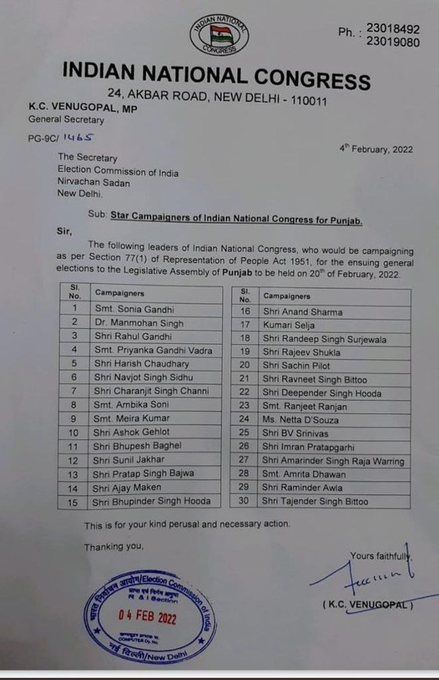 कांग्रेस ने पंजाब विधानसभा चुनाव के लिए 30 स्टार प्रचारकों की लिस्ट जारी की है। इस लिस्ट में टिकट गंवाने वाले रमिंदर आवला का नाम भी शामिल है। पूर्व पीएम मनमोहन सिंह, कांग्रेस अंतरिम अध्यक्ष सोनिया गांधी, राहुल गांधी, प्रियंका गांधी वाड्रा, भूपिंदर सिंह हुड्डा, और आनंद शर्मा पंजाब विधानसभा चुनाव के लिए कांग्रेस के स्टार प्रचारकों में से हैं।