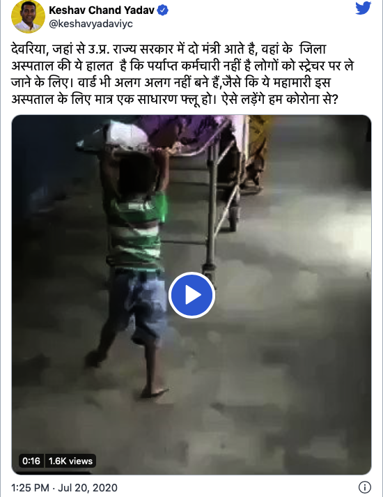 इस वीडियो को इंडियन यूथ कांग्रेस के सदस्य केशव चंद यादव ने शेयर किया। उन्होंने इस वीडियो को शेयर करते हुए लिखा, “देवरिया, जहां से उ.प्र. राज्य सरकार में दो मंत्री आते है, वहां के जिला अस्पताल की ये हालत है कि पर्याप्त कर्मचारी नहीं है लोगों को स्ट्रेचर पर ले जाने के लिए। वार्ड भी अलग अलग नहीं बने हैं,जैसे कि ये महामारी इस अस्पताल के लिए मात्र एक साधारण फ्लू हो। ऐसे लड़ेंगे हम कोरोना से?”