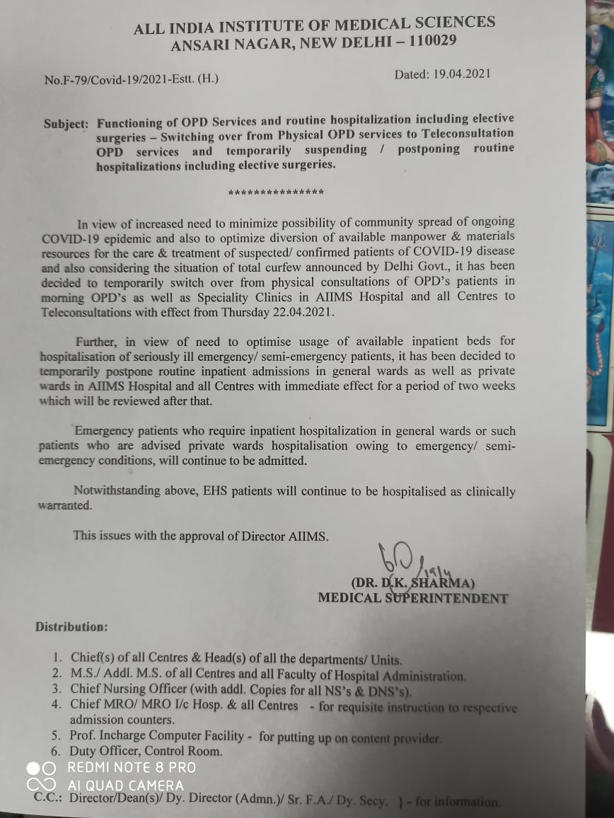 जारी आदेश के मुताबिक एम्स पूरी तरह से कोरोना की स्थिति पर बल देगा। जिन मरीजों का ऑपरेशन होना या तारीख पहले से तय थी उनकी तारीखों को भी आगे बढा दिया गया है। हालांकि, आपातकाल की स्थिति में मरीजों को भर्ती किया जा सकेगा। दिल्ली के अलावा अन्य राज्यों के एम्स अस्पतालों ने ओपीडी सेवाओं को बंद कर दिया है।ऋषिकेष एम्स ने कदम उठाया है। डॉक्टर फोन के जरिए मरीजों को सलाह देंगे।