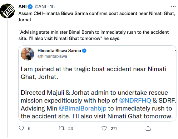 असम के मुख्यमंत्री हिमंता बिस्वा सरमा ने नाव हादसे पर दुख जताया है। उन्होंने माजुली और जोरहाट जिला प्रशासन को एनडीआरएफ और एसडीआरएफ की मदद से बचाव अभियान चलाने के निर्देश दिए हैं। फिलहाल सर्च-ऑपरेशन जारी है। उन्होंने अपने मंत्री बिमल बोरा को शीघ्र माजुली जाकर स्थिति का जायजा लेने को कहा है।