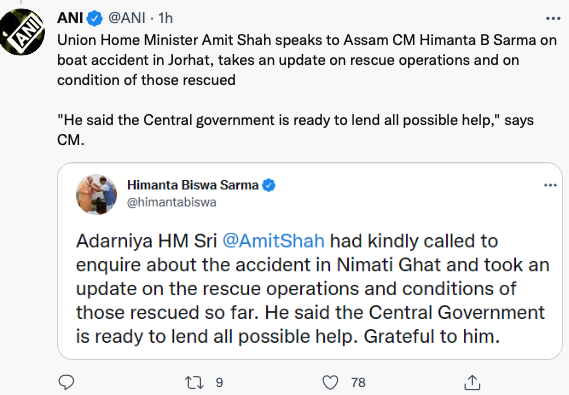 मुख्यमंत्री ने बताया, "केंद्रीय गृह मंत्री अमित शाह ने फोन पर जोरहाट के नीमतीघाट में नाव दुर्घटना के बारे में पूछा है और अब तक बचाए गए लोगों की स्थिति के बारे में जानकारी ली है।"