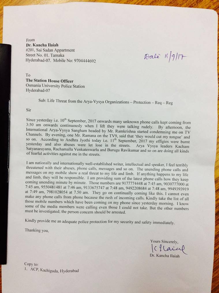लेखक डॉ. कांचा इलैय्या ने सोमवार दावा किया कि वह उन्हें रविवार की दोपहर के बाद से कई फोन कॉल आ रहे हैं, जिसमें उनकी जीभ काट देने की भी धमकी दी गई। उन्होंने कहा,"किसी ने मेरी जीभ काटने की धमकी दी, मेरा पुतला जलाया गया, मुझे लगता है कि उनके दुर्व्यवहार, फोन कॉल और संदेशों द्वारा बहुत खतरा है। यदि मेरे साथ कुछ भी होता है तो वे जिम्मेदार होंगे”