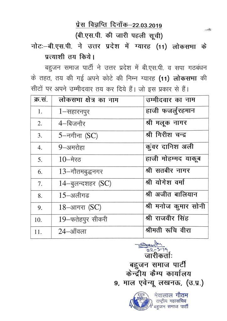 बहुजन समाज पार्टी ने उत्तर प्रदेश में गठबंधन के तहत तय की गयी अपनी कोटे की सीटों के लिए 11 उम्मीदवारों की पहली लिस्ट शुक्रवार को जारी कर दी। वहीं, समाजवादी पार्टी ने गाजियाबाद से अपना प्रत्याशी बदल दिया है।