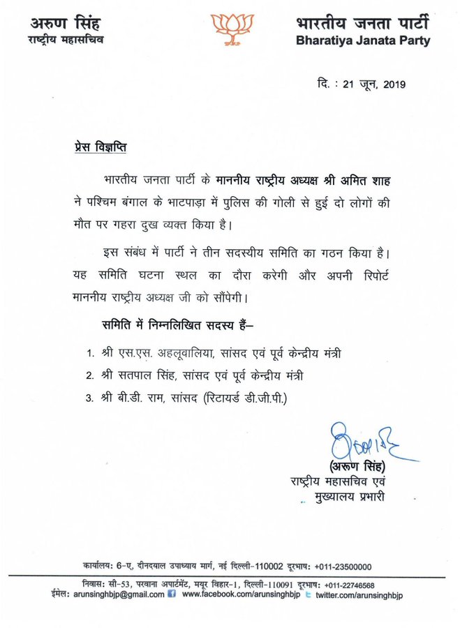 पश्चिम बंगाल के उत्तर परगना के भाटपारा शहर में स्थिति अब भी तनावपूर्ण बनी हुई है। भारतीय जनता पार्टी(बीजेपी) लगातार भाटपारा हिंसा पर मुख्यमंत्री ममता बनर्जी को घेरने में जुटी है। भाटपारा हिंसा के विरोध में कोलकाता में तीन सांसदों का दल शनिवार को पहुंचेगा और हिंसा के खिलाफ विरोध जताएगा। सांसद एसएस अहलूवालिया के नेतृत्व में एक टीम शनिवार को कोलकाता पहुंच रही है। टीम में उनके अलावा सांसद सत्यपाल सिंह और बी डी राम होंगे। सांसद टीएमसी सरकार के खिलाफ मार्च भी करेंगे।