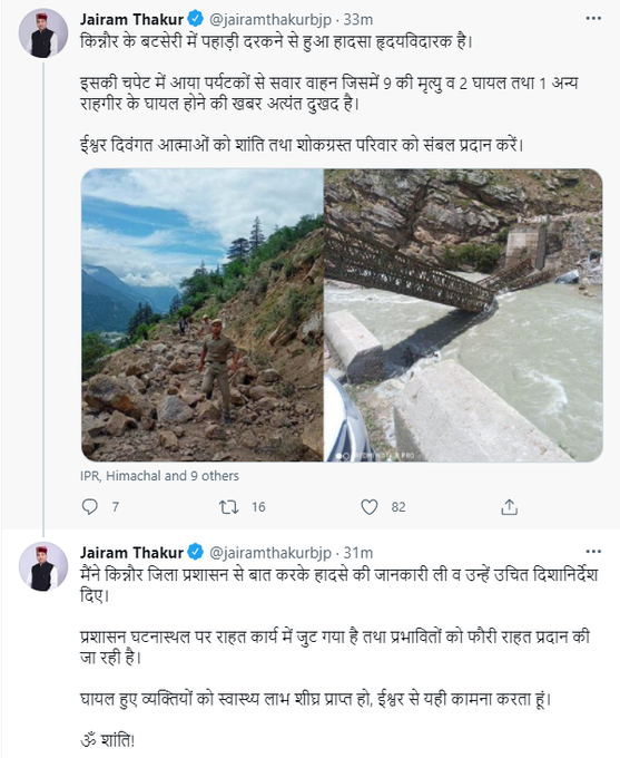 जानकारी मिलने पर हिमाचल प्रदेश के मुख्यमंत्री जयराम ठाकुर ने कहा है कि किन्नौर के बटसेरी में पहाड़ी दरकने से हुआ हादसा हृदयविदारक है। इस हादसे में 9 मृत्यु व 3 घायल होने की खबर दुखद है। मैंने किन्नौर ज़िला प्रशासन से बात करके हादसे की जानकारी ली व उन्हें उचित दिशानिर्देश दिए। प्रशासन घटनास्थल पर राहत कार्य में जुट है।