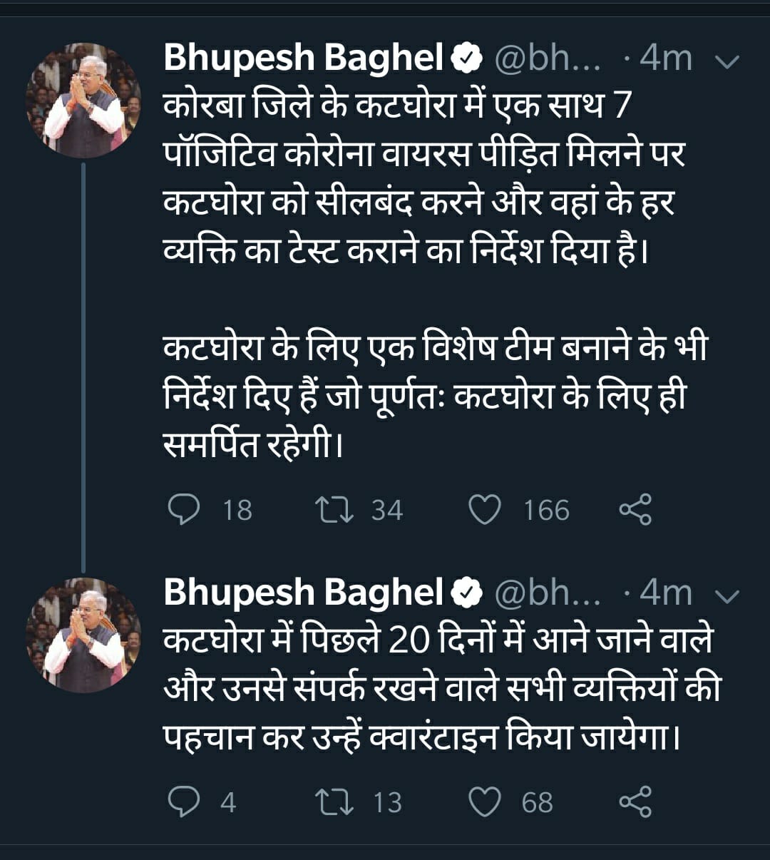आपको बता दें कि जिस इलाके में कोरोना पॉजेटिव मरीज मिले हैं, वह करीब दो से ढाई हजार की आबादी वाली सघन बस्ती है, लिहाजा संक्रमण फैलने का खतरा बढ़ गया है। मुख्यमंत्री ने कटघोरा शहर को पूरी तरह सील करने के आदेश दिए हैं। बघेल ने ट्वीट कर कहा कि कटघोरा में रहने वाले हर व्यक्ति का टेस्ट होगा। पिछले 20 दिनों में कटघोरा से आने-जाने वाले हर व्यक्ति की पहचान कर उसे क्वारन्टीन किया जाएगा।