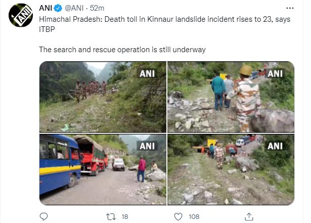 हिमाचल प्रदेश के किन्नौर में भूस्खलन स्थल मरने वालों की संख्या आज बढ़कर 23 हो गई है। यहां अभी भी करीब 20 लोगों के लापता होने की खबर है। वहीं, दूसरी ओर बचाव और तलाशी अभियान जारी है।