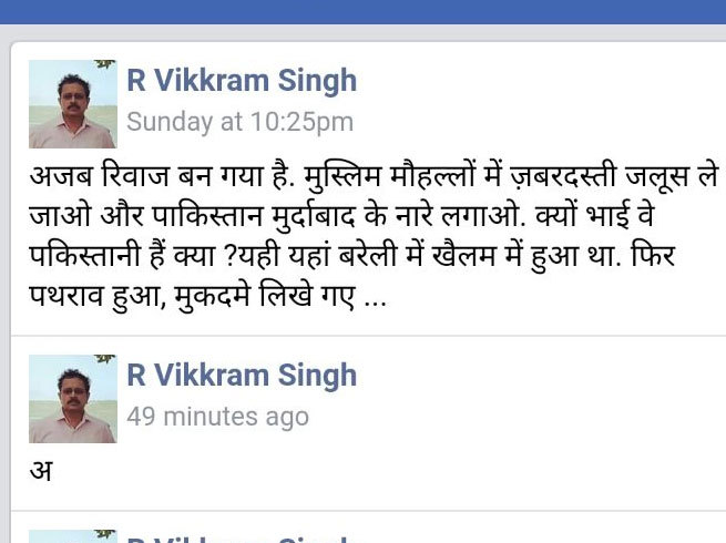 उन्होंने फेसबुक पर लिखा, “अजब रिवाज बन गया है। मुस्लिम मोहल्लों में जबरदस्ती जुलूस ले जाओ और पाकिस्तान मुर्दाबाद के नारे लगाओ। क्यों भाई वे पकिस्तानी हैं क्या? यही यहां बरेली में खैलम में हुआ था। फिर पथराव हुआ, मुकदमे लिखे गए…”