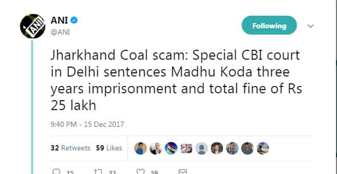 निर्दलीय विधायक रहे 46 साल के कोड़ा सितंबर 2006 से अगस्त 2008 तक झारखंड के मुख्यमंत्री थे। अदालत ने बीते 13 दिसंबर को इस मामले में कोड़ा और तीन अन्य को आपराधिक षड्यंत्र और धारा 120 बी के तहत दोषी माना था। यह मामला झारखंड में राजहरा नॉर्थ कोल ब्लॉक को कोलकाता की विनी आयरन एंड स्टील उद्योग लिमिटेड को आवंटित करने में गड़बड़ियों से जुड़ा है।
