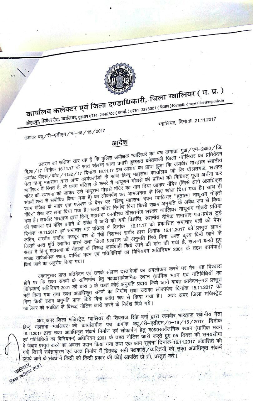 इससे पहले कल अखिल भारत हिन्दू महासभा ने जिला प्रशासन के नोटिस का अभिभाषक के माध्यम से जवाब दे दिया है। प्रदेश में कांग्रेस पार्टी ने महात्मा गांधी के हत्यारे की मूर्ति स्थापना को लेकर प्रदेश भर में प्रदर्शन और मूर्ति हटाने को लेकर ज्ञापन सौंपा था।