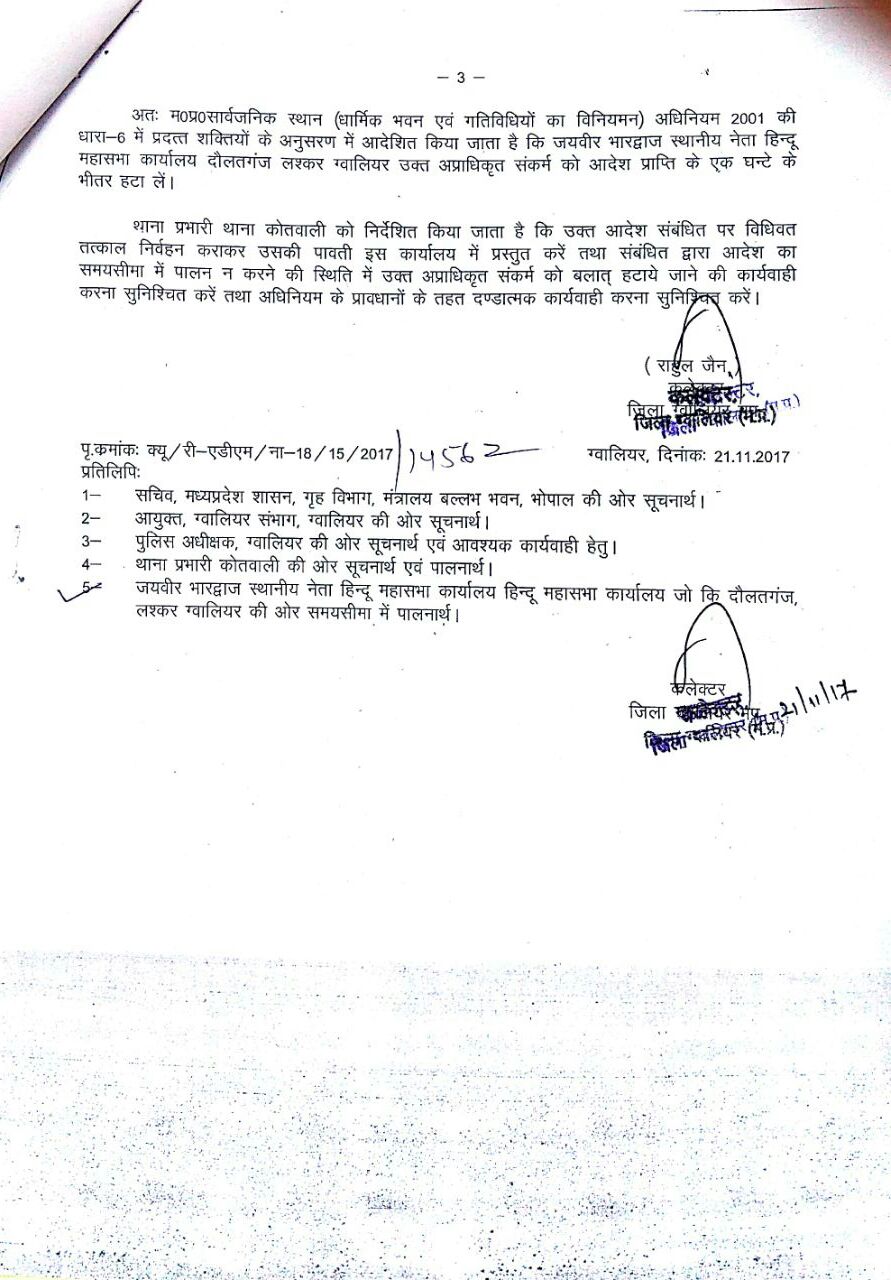 आखिरकार ग्वालियर जिला प्रशासन ने अखिल भारतीय हिन्दू महासभा द्वारा अपने कार्यालय में स्थापित की गई महात्मा गांधी के हत्यारे की मूर्ति को हटा दी है। इस कार्यवाही में प्रशासन ग्वालियर के दौलतगंज में स्थित हिन्दू महासभा के दफ्तर पहुंचा और कार्यालय में लगे ताले को तोड़ डाला।