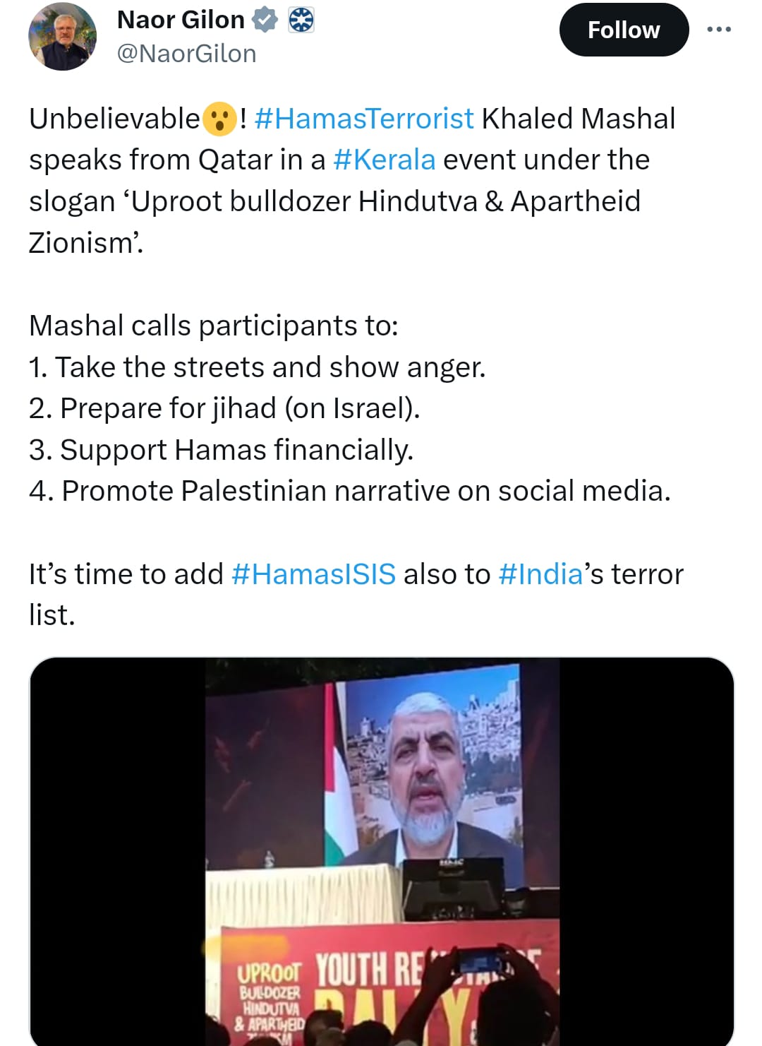 शनिवार को विरोध प्रदर्शन में हमास नेता की भागीदारी पर प्रतिक्रिया व्यक्त करते हुए, भारत में इजराइल के राजदूत नाओर गिलोन ने अपने एक्स हैंडल से पोस्ट किया, "मशाल ने प्रतिभागियों से कहा: सड़कों पर उतरें और गुस्सा दिखाएं, जिहाद के लिए तैयार रहें (इजराइल के खिलाफ), समर्थन करें हमास आर्थिक रूप से, सोशल मीडिया पर फिलिस्तीनी कथा को बढ़ावा देता है, अब #हमासआईएसआईएस को #भारत की आतंकवादी सूची में जोड़ने का समय आ गया है।''