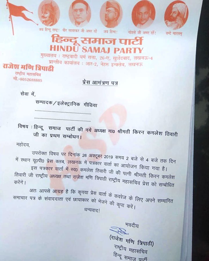 हिंदूवादी नेता कमलेश तिवारी की हत्या के बाद उनकी पत्नी किरण तिवारी को हिंदू समाज पार्टी का नया अध्यक्ष घोषित किया गया है। बता दें कि हिंदू समाज पार्टी के अध्यक्ष कमलेश तिवारी की 18 अक्टूबर को लखनऊ के नाका इलाके में हत्या कर दी गई थी। कमलेश की हत्या के बाद किरण ने परिवार समेत मुख्यमंत्री योगी आदित्यनाथ से मुलाकात की थी और हत्यारों के लिए फांसी की सजा की मांग की थी।