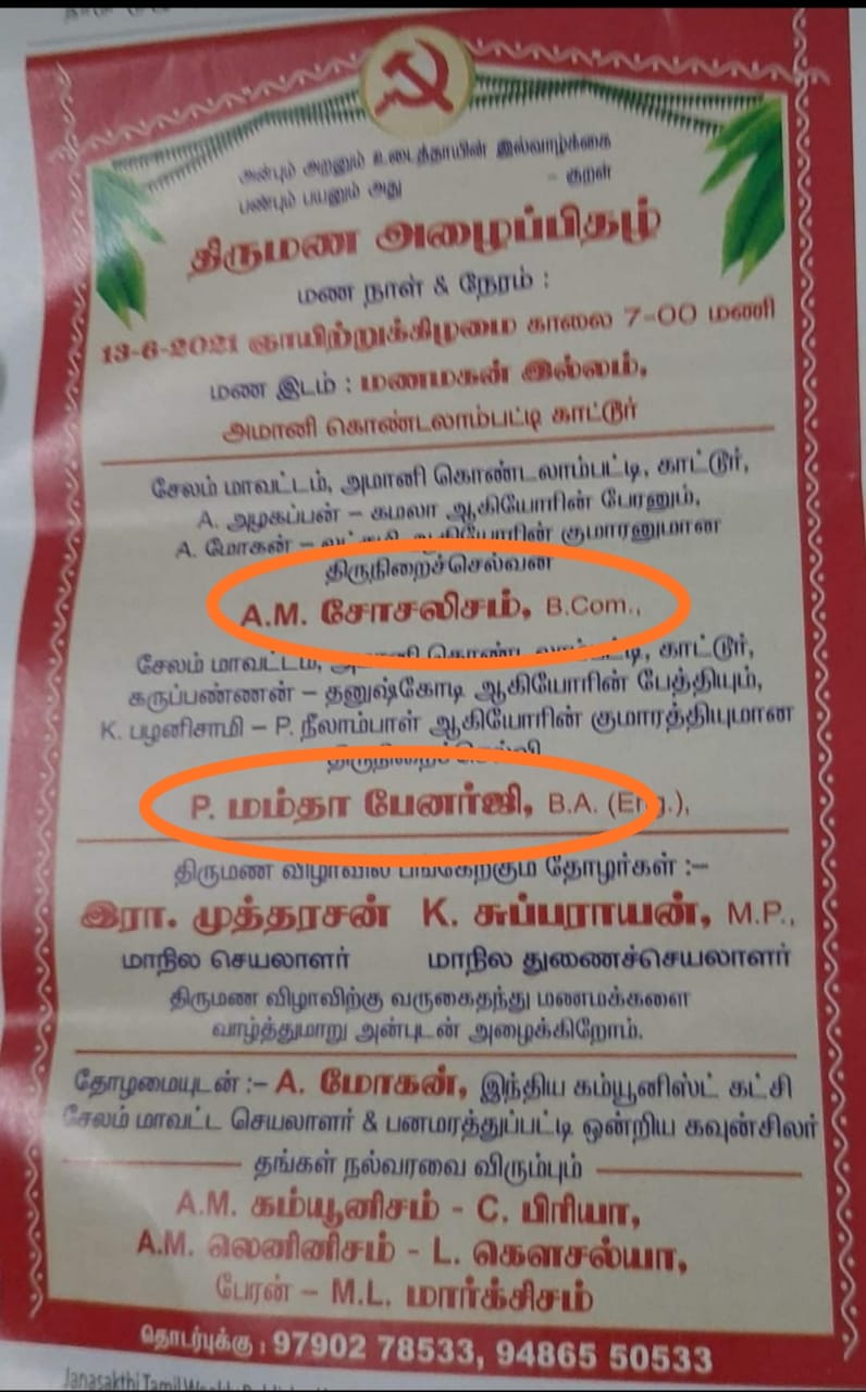 तमिलनाडु के सलेम में रविवार को हुई ममता बनर्जी और सोशलिज्म की शादी चर्चा का विषय बन गई है। इस खास शादी का निमंत्रण सोशल मीडिया पर कुछ दिनों पहले वायरल हुआ था। इतना ही कार्ड में लिखे कम्युनिज्म, लेनिनिज्म और मार्क्सिज्म नाम वाले बारातियों ने भी काफी सुर्खियां बटोरी। आप सभी हैरान होंगे की ये राजनीतिक पार्टियों के नाम वाले दुल्हा-दुल्हन और बारातियों का चक्कर क्या है?