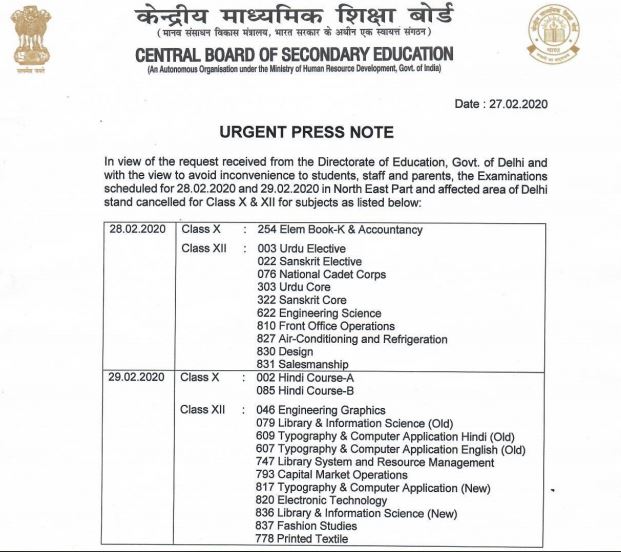 दिल्ली के विभिन्न इलाकों में हिंसक घटनाओं के चलते सीबीएसई ने उत्तर पूर्वी दिल्ली में 26 और 27 फरवरी को होने वाली बोर्ड परीक्षाएं स्थगित कर दी थीं। इन परीक्षाओं को लेकर सीबीएसई ने कहा है कि छात्र चिंता ने करें, जिनकी परीक्षाएं हिंसा के चलते छूट गई हैं, वह जल्द ही कराई जाएंगी। सीबीएसई ने ये भी ऐलान किया है कि 2 मार्च से 10वीं और 12वीं की निर्धारित परीक्षा में कोई बदलाव नहीं किया गया है।