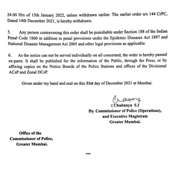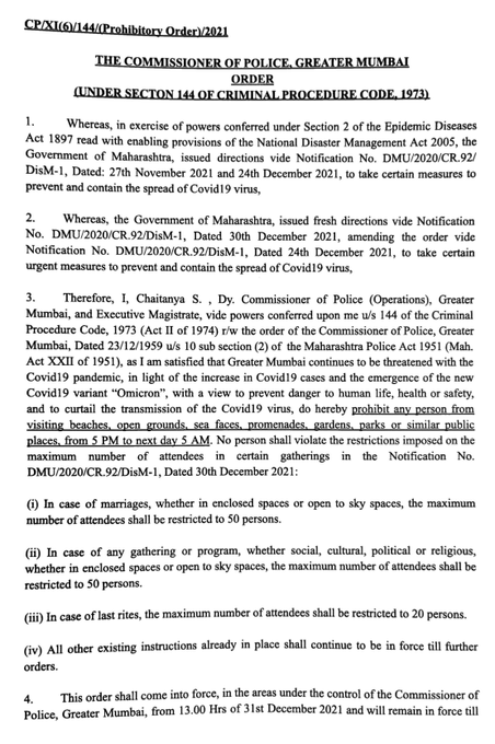- यह आदेश, पुलिस आयुक्त, ग्रेटर मुंबई के नियंत्रण वाले क्षेत्रों में, 31 दिसंबर 2021 के दिन में 1 बजे से लागू होगा और 15 जनवरी 2022 की रात 12.00 बजे तक लागू रहेगा। 14 दिसंबर 2021 को सीआरपीसी की धारा 144 के तहत पहले के आदेश को वापस ले लिया गया है।