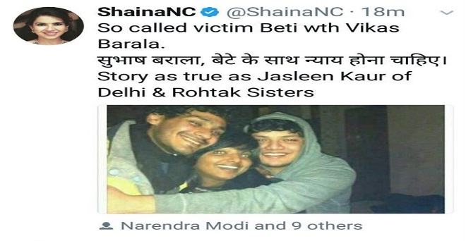 इस ट्वीट में शाइना एनसी के अकाउंट से लिखा गया था ''तथाकथित पीड़ित बेटी के साथ विकास बराला। सुभाष बराला के बेटे के साथ न्याय होना चाहिए। ये कहानी उतनी ही सच है जितनी दिल्ली की जसलीन कौर और रोहतक बहनों की थी।''