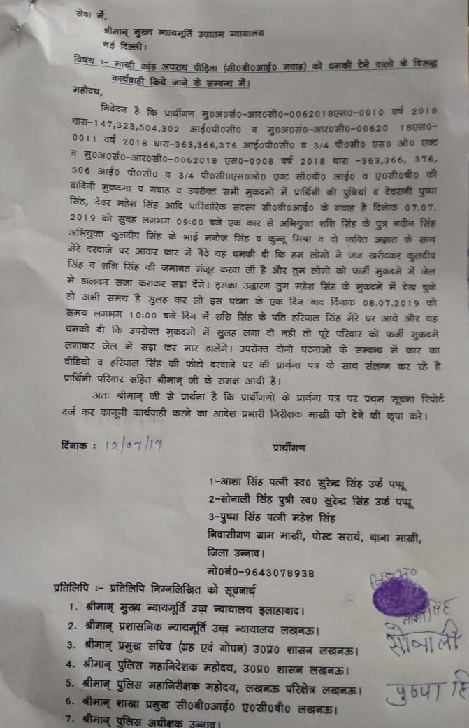 पीड़िता की मां द्वारा सीजेआई को लिखी गई चिट्ठी में बताया गया है कि विधायक के भाई ने उन्हें धमकी दी कि उन्होंने जज को खरीदकर विधायक कुलदीप सिंह सेंगर और शशि सिंह की जमानत मंजूर करवा ली है और अगर तुम लोगों को फर्जी मुकद्में में फंसाकर जेल में सड़ा देंगे। इसका उदाहरण तुम महेश सिंह के मुकदमे में देख चुके हो अभी समय है सुलह कर लो।