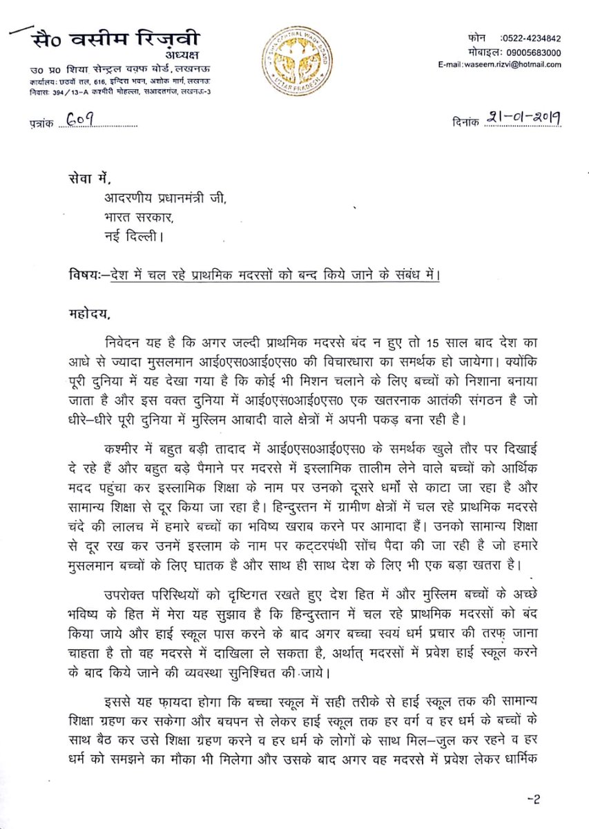 उत्तर प्रदेश शिया वक्फ बोर्ड के अध्यक्ष वसीम रिजवी ने प्रधानमंत्री नरेंद्र मोदी को पत्र लिखकर देश में चल रहे मदरसों को बंद करने का अनुरोध किया है। रिजवी ने कहा है कि इन मदरसों में आतंकी संगठन (आईएसआईएस) की विचारधारा को प्रमोट किया जाता है, जिसका असर बच्चों पर पड़ता है।
