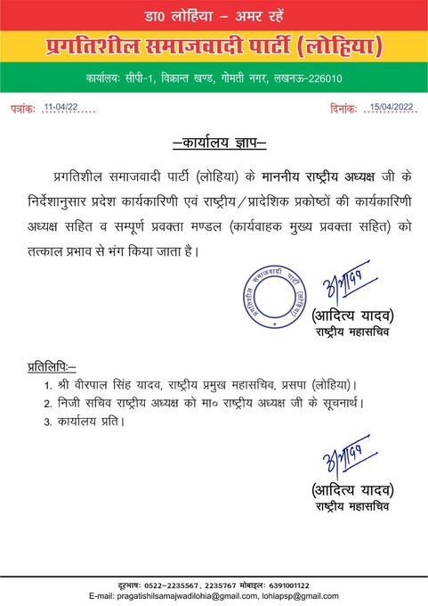 पार्टी के महासचिव और शिवपाल यादव के बेटे आदित्य यादव की ओर से जारी आदेश में कहा गया है, ''प्रगतिशील समाजवादी पार्टी (लोहिया) के माननीय राष्ट्रीय अध्यक्ष (शिवपाल यादव) के निर्देशानुसार प्रदेश कार्यकारिणी एवं राष्ट्रीय/प्रादेशिक प्रकोष्ठों की कार्यकारिणी अध्यक्ष सहित संपूर्ण प्रवक्ता मंडल (कार्यवाहक मुख्य प्रवक्ता सहित) को तत्काल प्रभाव से भंग किया जाता है।''