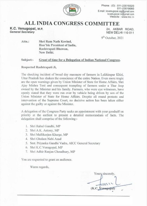 लखीमपुर खीरी हिंसा मामले में कांग्रेस ने राहुल गांधी के नेतृत्व में पत्र लिखकर पार्टी के 7 सदस्यीय प्रतिनिधिमंडल के लिए राष्ट्रपति रामनाथ कोविंद से मिलने का समय मांगा ताकि तथ्यों का विस्तृत ज्ञापन पेश किया जा सके।