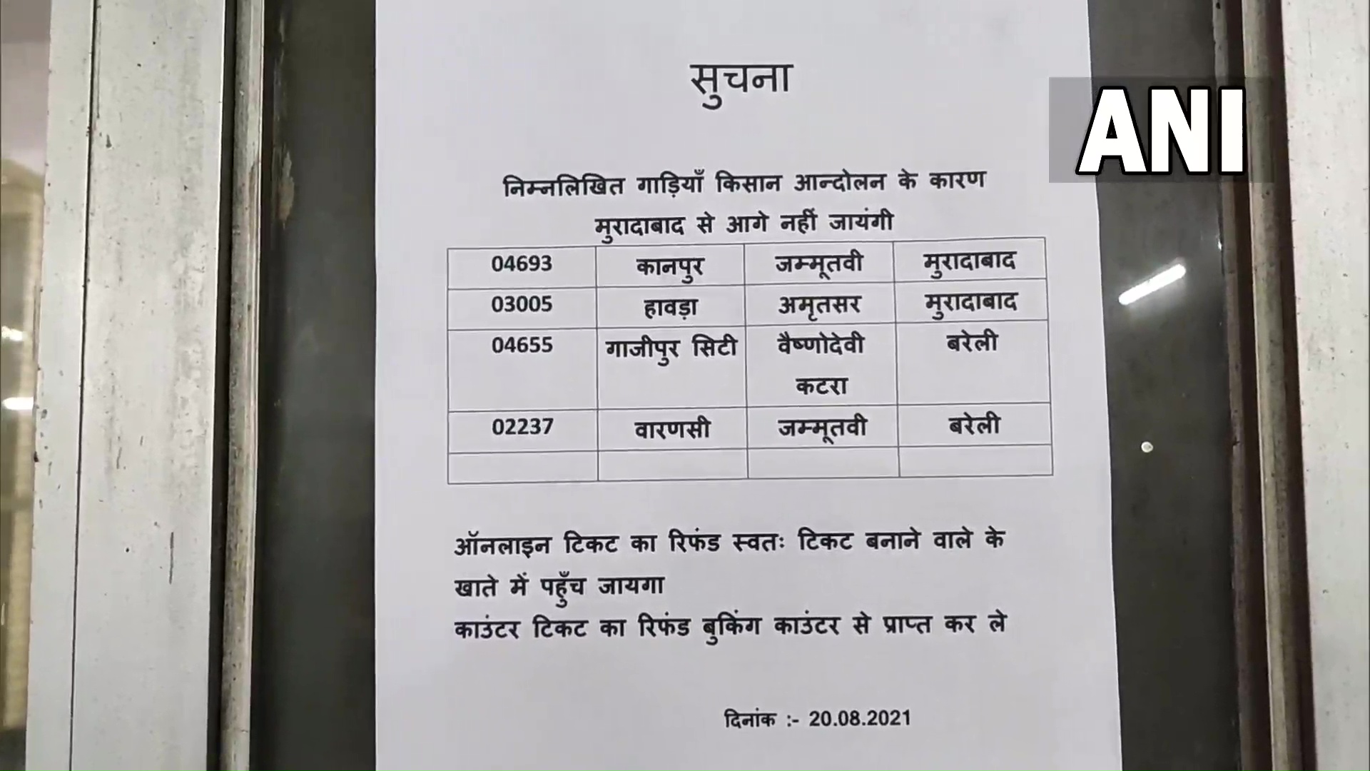 न्यूज़ एजेंसी एएनआई के मुताबिक, मुरादाबाद रेलवे स्टेशन के सीएमआई जेके ठाकुर ने बताया कि किसान आंदोलन के चलते मुरादाबाद और बरेली में दो-दो ट्रेनें रद्द की गई हैं। उन्होंने बताया कि यात्रियों को टिकट का पैसा रिफंड करने के लिए पांच काउंटर खोले गए हैं।