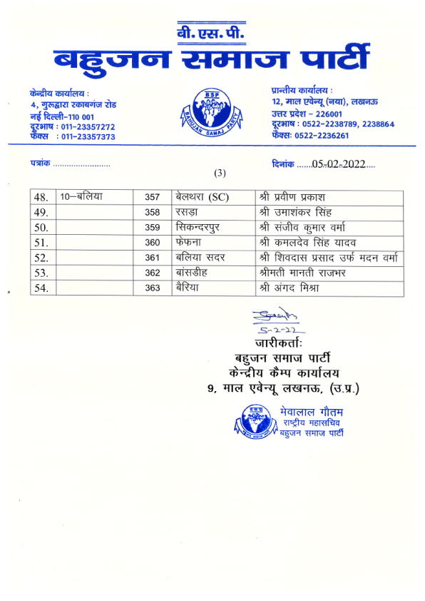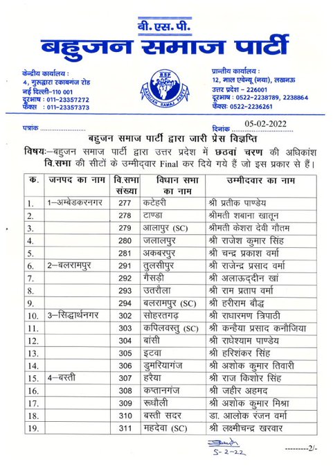 उत्तर प्रदेश विधानसभा चुनाव 2022 के लिए बहुजन समाजवादी पार्टी (बसपा) ने एक और लिस्ट जारी की है। छठवें चरण की इस लिस्ट में अवध और पूर्वांचल के 54 उम्मीदवारों के नाम का ऐलान किया गया। इसमें अंबेडकरनगर, बलरामपुर, सिद्धार्थनगर, बस्ती, संतकबीर नगर, महाराजगंज, गोरखपुर, कुशीनगर, देवरिया और बलिया जिले की विधानसभा सीटों से लड़ने वाले प्रत्याशियों के नाम की घोषणा की गई है। बता दें कि छठवें चरण में दस जिलों के 57 विधानसभा क्षेत्र में तीन मार्च को मतदान होगा।