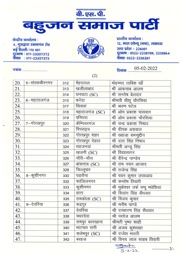 बहुजन समाज पार्टी ने गोरखपुर सदर से सीएम योगी आदित्यनाथ के खिलाफ ख्वाजा शमसुद्दीन को मैदान में उतारा है। कुशीनगर के फाजिलनगर में संतोष तिवारी समाजवादी पार्टी के प्रत्याशी स्वामी प्रसाद मौर्य को चुनौती देंगे। बहुजन समाज पार्टी के लखनऊ में केन्द्रीय कैम्प कार्यालय से जारी इस सूची में अम्बेडकरनगर, बलरामपुर, सिद्धार्थनगर, बस्ती, संतकबीर नगर, महाराजगंज, गोरखपुर, कुशीनगर, देवरिया और बलिया जिले के विधानसभा क्षेत्र के प्रत्याशियों के नाम हैं। इसके साथ ही सथ बस्ती, संतकबीरगर, महाराजगंज गोरखपुर, कुशीनगर, देवरिया तथा बलिया की सभी सीट के प्रत्याशियों का नाम भी घोषित किया है।