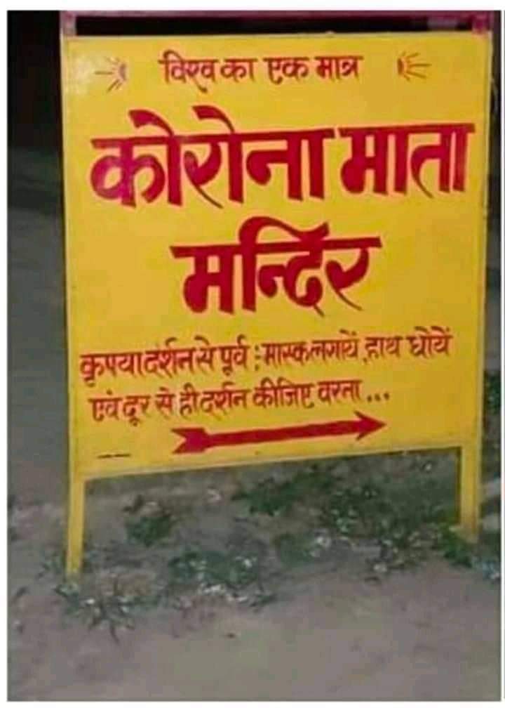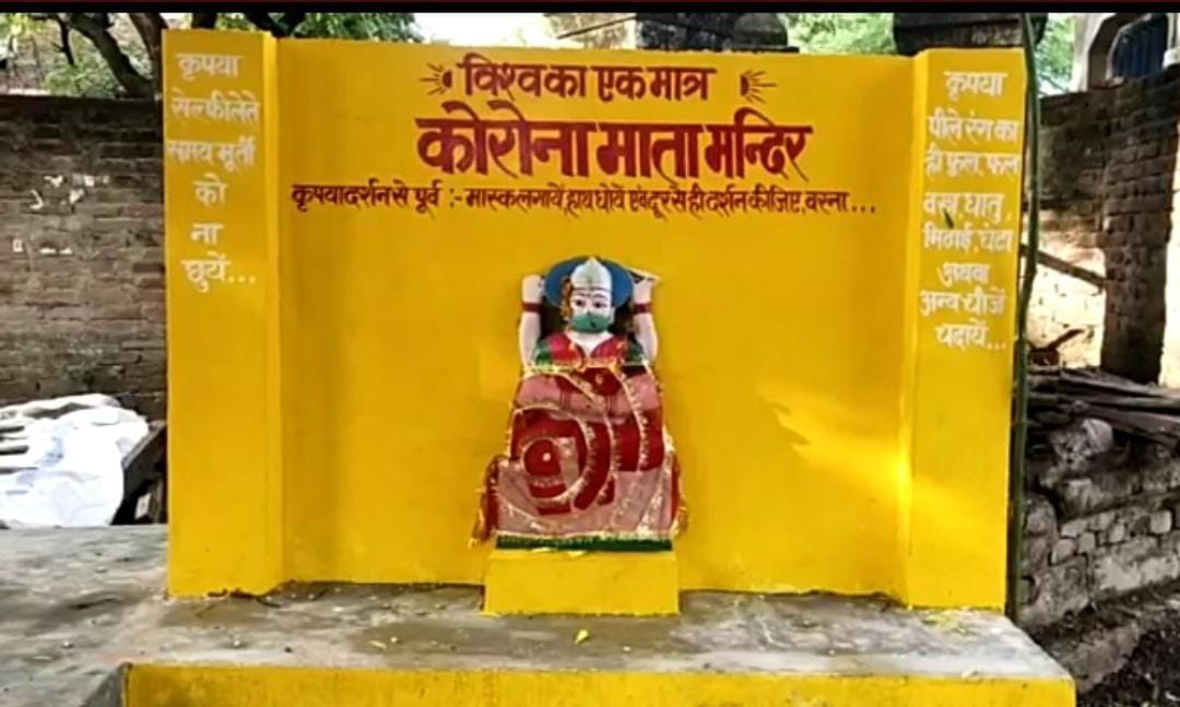 यह पूरा मामला यूपी के प्रतापगढ़ में सांगीपुर थाना के जूही शुक्लपुर गांव का है। जहां ग्रामीणों ने कुछ दिन पहले कोविड-19 के चलते अंधविश्वास में कोरोना माता मंदिर बनवा दिया था। इतना ही नहीं गांव की गलियों में एक मंदिर का एक बोर्ड भी लगवा दिया, जिसमें साफ निर्देश लिखे हुए हैं कि मास्क लगाए, हांथ धोयें एवं दूर से ही दर्शन कीजिए वरना.... यही नहीं ग्रामीणों ने कोरोना माता की मूर्ति को मास्क भी लगाया था।