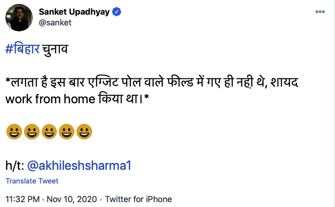 एनडीटीवी के पत्रकार और एंकर संकेत उपाध्याय ने परिणाम आने के बाद अपने ट्वीटर हैंडल से तंज कसते हुए लिखा, "लगता है इस बार एग्जिट पोल वाले फील्ड में गए ही नही़ थे, शायद वर्क फ्रॉम होम किया था।"