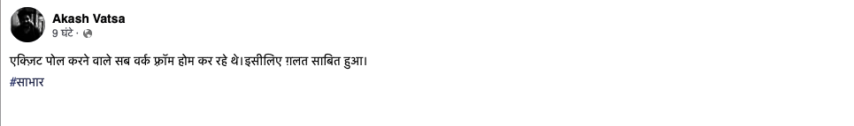 इसी तरह से एक फेसबुक यूजर आकाश वत्स लिखते हैं, “एग्जिट पोल करने वाले सभी वर्क फ्रॉम होम कर रहे थे। इसीलिए गलत साबित हुआ।“