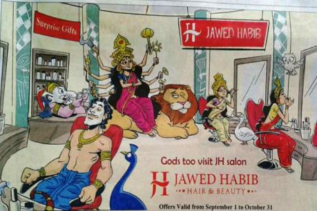 कोलकाता के एक अखबार में छपे ‘गॉड टू विजिट जेएस सैलून’ विज्ञापन में कार्तिकेय फेशियल करवा रहे हैं। गणेश जी गल्ले पर बैठे पैसे गिन रहे हैं, लक्ष्मी देवी मेकअप कर रही हैं, दुर्गा माता क्यू में हैं तो कई अन्य देवी-देवता भी बैठे हैं।