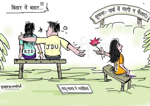 दिलीप मंडल ने फेसबुक पर नीतीश कुमार का एक फोटो शेयर कर कहा है कि ये है नीतीश कुमार की अंतरआत्मा। साथ ही उन्होंने लिखा कि ये हमेशा मौका देखकर किसी न किसी की पीठ पर चढ़ते रहे हैं।
