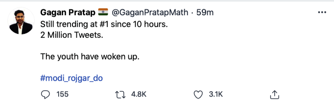 बीते साल भी जब कोरोना महामारी की वजह से कई प्रतियोगी परिक्षाएं को स्थगित कर दिया था तो युवाओं ने “मैं भी बेरोजगार” अभियान चलाया था। दरअसल, 2019 के लोकसभा चुनाव से पहले पीएम मोदी ने “मैं भी चौकीदार” अभियान चलाया था जिसको युवाओं ने बढ़ती बेरोजगारी दर के बीच आड़े हाथ लिया और केंद्र के खिलाफ मुहिम छेड़ दी।