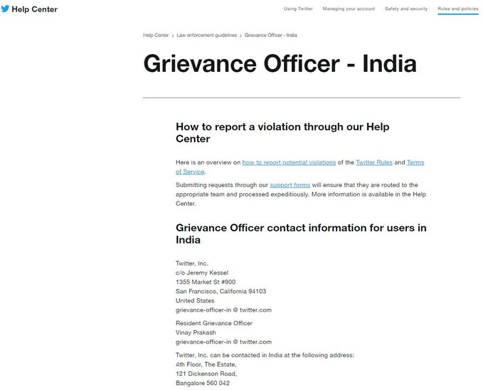 माइक्रो ब्लॉगिंग साइट ट्विटर ने केंद्र सरकार के साथ गतिरोध के बीच विनय प्रकाश को भारत के लिए अपना रेजिडेंट ग्रीवेंस ऑफिसर नियुक्त किया है। इसके साथ ही ट्विटर ने भारत में नामित किए गए अधिकारी का स्थानीय पता भी प्रदर्शित किया है। जिससे की यदि कोई उनसे संपर्क करना चाहता है तो कर सकता है।