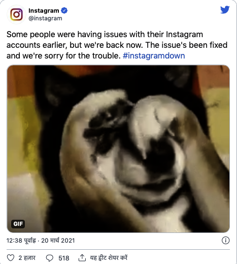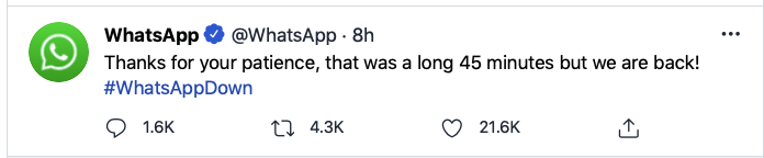 ठीक होने के बाद व्हाट्सएप और इंस्टाग्राम सोशल मीडिया प्लेटफॉर्म्स ने इसकी सूचना अपने यूजर्स को दी। व्हाट्सएप की तरफ से कहा गया कि कुछ समय के लिए दिक्कतें आई थी लेकिन अब सब सही हो गया है। व्हाट्सएप ने लिखा, आपके धैर्य के लिए शुक्रिया, ये 45 मिनट का मसला था,लेकिन अब हम वापस आ गए हैं। इंस्टाग्राम ने भी जानकारी देते हुए कहा कि कुछ लोगों इंस्टाग्राम अकाउंट्स के साथ समस्या आई, लेकिन अब हम वापस आ गए हैं। परेशानी के लिए खेद है।