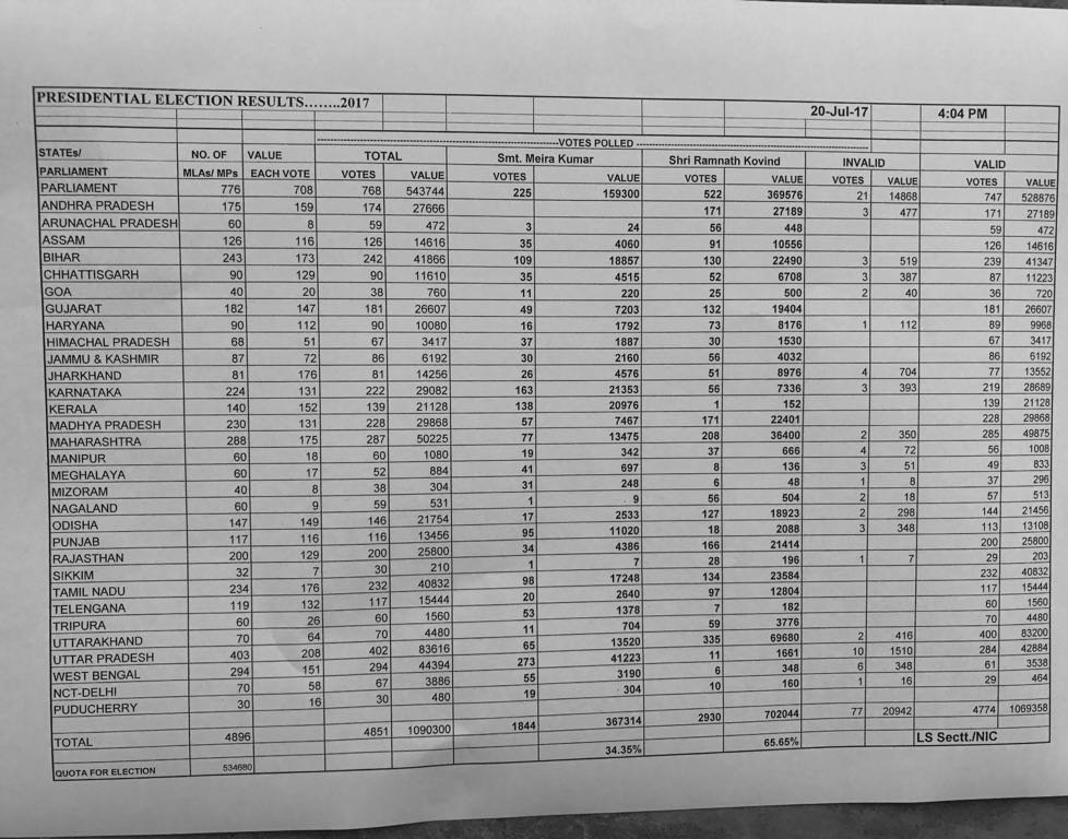 संसद के कुल 768 सदस्यों में से 522 ने रामनाथ कोविंद और 225 ने मीरा कुमार को वोट दिया है। 21 सांसदों के वोट अमान्य करार दिए गए हैं। राष्ट्रपति चुनाव का संपूर्ण परिणाम यहां देखा जा सकता है। चुनाव नतीजों के मुताबिक, रामनाथ कोविंद ने 7,02,044 मूल्य के मत हासिल किए जबकि मीरा कुमार के खाते में 3,67,314 मूल्य के वोट आए हैं।